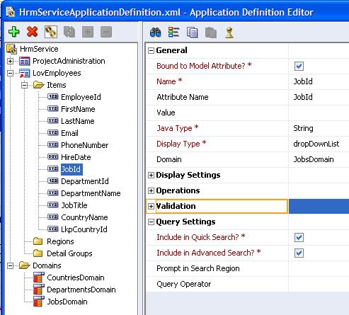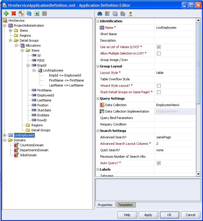 Now things will get a little more interesting. I have indicated which items in the LovEmployees Group should appear in the table layout – the list of employees to select from – and which are search items that must be part of the Advanced Search region. For example: JobTitle is displayed in the table layout – but is not one of the Advanced Search items – while the associated JobId is not shown in the table but is an Advanced Search Item. The same relationship exists between CountryName and LkpCountryId and between DepartmentId and DepartmentName.