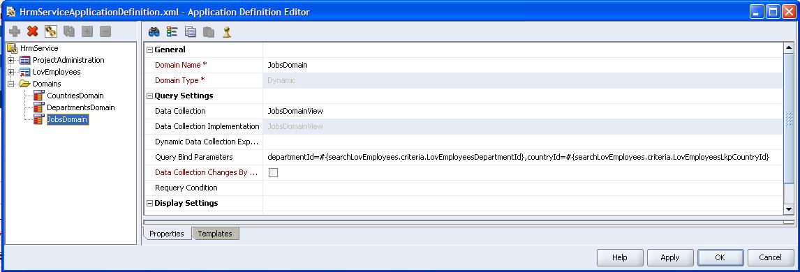 Note that this SelectOneChoice has its partialTrigger attribute referring to the LkpCountryId and the JobId items; this is generated because of the Depends On Item(s) property setting. The value binding expressions for the DepartmentId search item turns out to be #{searchLovEmployees.criteria.LovEmployeesDepartmentId}. This is the expression we will use to provide a bind parameter value. Let’s take the JobsDomain. Remember that the ViewObject JobsDomainView underlying this Domain has two bind parameters: countryId and departmentId. We can provide the bind parameter values – or rather have JHeadstart take of providing the proper values – by setting the Query Bind Parameters property for the JobsDomain domain: