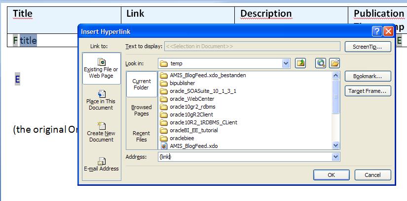My first steps with Oracle BI Publisher Enterprise Edition 10.1.3.2: create a report based on the OraBlogs rss-feed BIPub CreateHyperlink