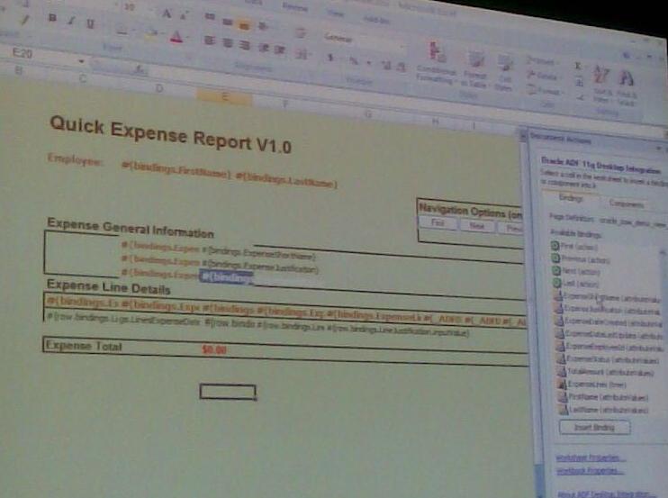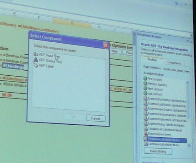 He showed how we will be able to use Excel as the client for ADF applications. Instead of having users go into a Swing Desktop client or the ADF Faces Web interface, they can use the tool they are perhaps most familiar with to review, analyze and manipulate the data. Excel is a client to the ADF Model and Business Services through which it downloads the data and uploads the data when the user submits the changes.