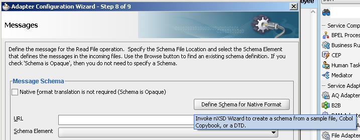 Press Next. On this page we can specify the Schema (XSD) for the file we will read. Or we can specify (Schema is opaque) that we will process the file as is. Or we can use the Native Format wizard for creating an XSD that we can use as representation for the file that will be read.