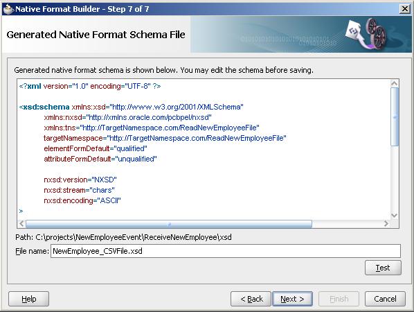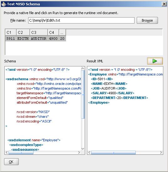 A new feature in 11g is the option to test the Schema file we have just created. Press the Test button. This window appears: