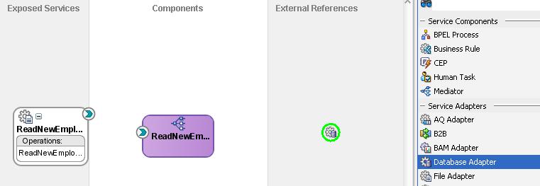 Time to wire the Service to the Mediator component. And also to wire the External Reference (database adapter service) into the Mediator component.