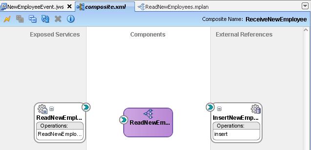 10. Create a wire from ReadNewEmployeesFile to the ReadNewEmployees Mediator component.