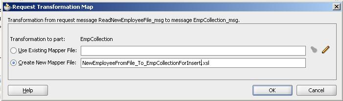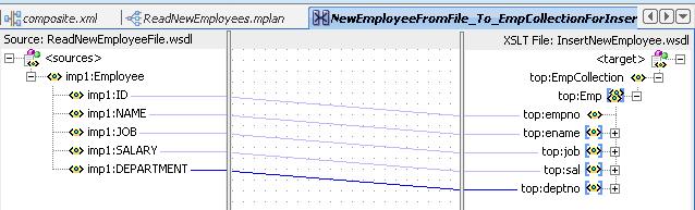 Double click the ReadNewEmployees component. Expand the Routing Rule already shown – that connects the File Adapter Service input via the Mediator to the Database Adapter Service Reference. Click on the Transformation Map icon.