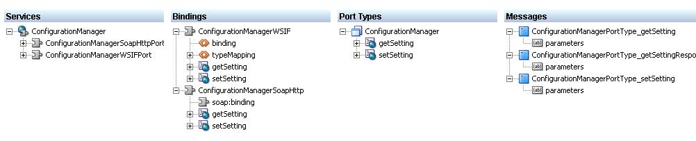 In order to invoke the ConfigurationManager from a BPEL process, we need to associate it with the process through a PartnerLinkType definition. For that, we need a WSDL document that describes the ConfigurationManager service. Typically WSDL documents describe SOAP based WebServices. However, through the Apache WSIF extensions to WSDL, we can define a WSDL document that describes a service implemented and accessed in various technologies and protocols.