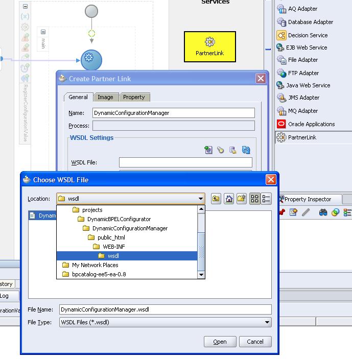 simply drag & drop the PartnerLink Service from the Service tab in the Component Palette. Enter the name for the PartnerLink. Then browse the file system for the WSDL we created in step 2. Accept the proposal to copy the WSDL to the project and to create a separate WSDL with the PartnerLink type and a reference to the copied WSDL. Then choose DynamicConfigurationManager_Role for the Partner Role and leave My Role empty.