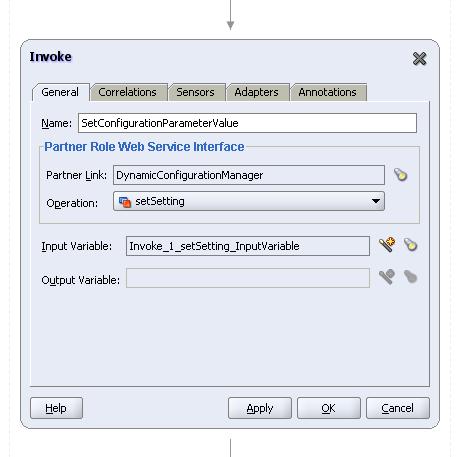 The DynamicConfigurationManager PartnerLink was created in the same way as described before for the RegisterConfigurationValue process. The Invoke activity now calls the getSetting operation, rather than setSetting. This call has both input and output parameters.