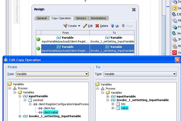 d. create an assign activity that copies the key and value to the input parameter for the invoke activity