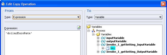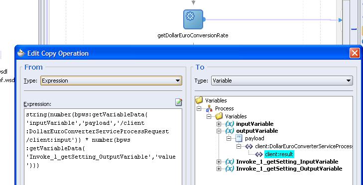– copy the outcome of the multiplication of the Dollar to Euro conversion rate (as returned from the DynamicConfigurationManager service) and the service input (the dollar amount) to the output variable: