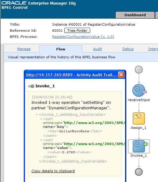 Well, we have our greate DollarEuroConverter to analyze the price in Euro. However , after firing up the BPEL engine, we first need to set today’s Dollar to Euro exchange rate (http://finance.yahoo.com/currency/convert?amt=1&from=USD&to=EUR&submit=Convert ) in the Dynamic Configuration Manager.
