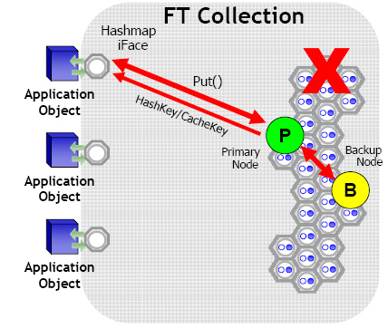 An application or service uses the grid through a familiar data structure, such as a Java HashMap or a .NET dictionary. When the application performs a put() to the HashMap, that operation is delegated to the grid, which then automatically elects a primary storage node and a backup storage node on another machine.  The nodes on the grid are continually aware of the status of all other nodes. They automatically and immediately detect failures and then rebalance the data storage and workload among the remaining nodes. If one of the primary storage node fails, the backup node becomes the primary and creates a new backup node.
