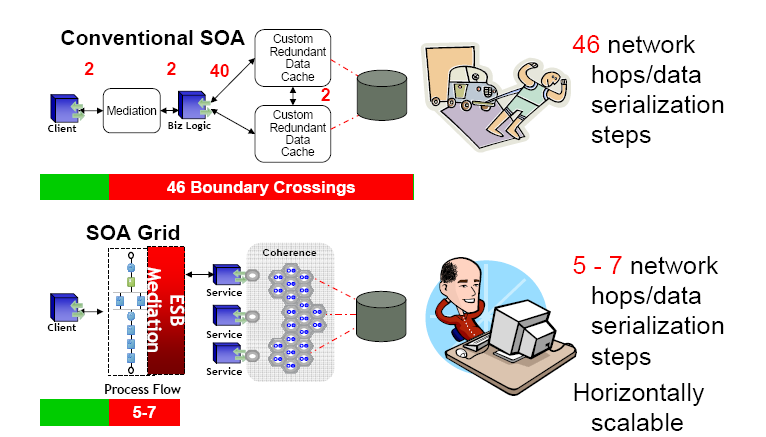 The SOA grid is a new approach to thinking about SOA infrastructure. It provides continuous availability for service implementations, data, and processing logic. It’s based on architecture that combines horizontally scalable, database-independent, middle-tier data caching with intelligent parallelization and an affinity of business logic with cache data. This enables newer, simpler, and more-efficient models for highly scalable service-oriented applications that can take full advantage of service virtualization and event-driven architectures.  The concept is based on a group of interconnected software processes that cooperate together across a network with the sole purpose of storing and maintaining instance data for individual application objects.