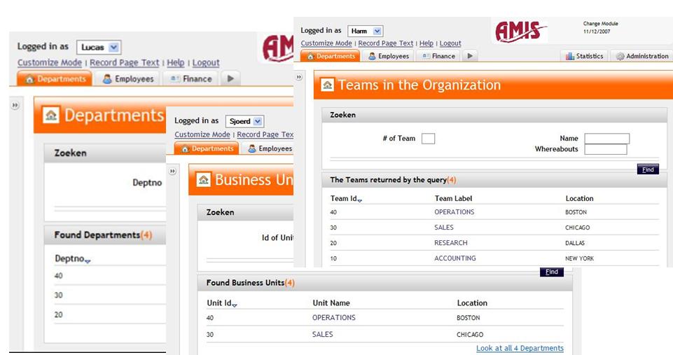 While of course the applications we build using ADF Faces technology are perfect and cater optimally to every end user’s needs, some end users seem to disagree. Even though we have just delivered the most wonderful and functional application to their door, they ask for changes. Frequently small changes, such as hide a certain component from a page, change the number of records visible in a table layout, change the set of columns shown in a summary table, change the list of allowable options for dropdownlists and radio groups and other such small changes. The screenshot demonstrates how for various users the numbers of records displayed in the table varies: