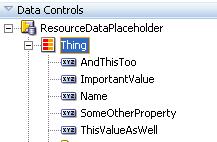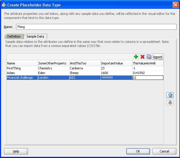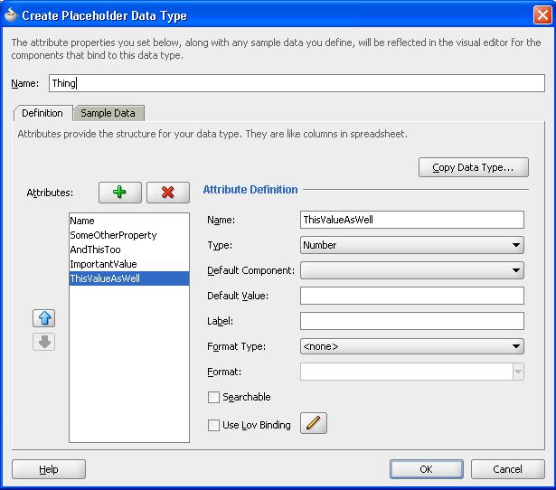 From the context menu on the new data control in the Data Control palette, choose Create Placeholder Data Type. In the window that opens, specify the Datatype – Thing – and its attributes – Name, SomeOtherProperty, AndThisToo, ImportantValue, ThisValueAsWell. On the Sample Data tab, provide some static sample data to use in this simple application.