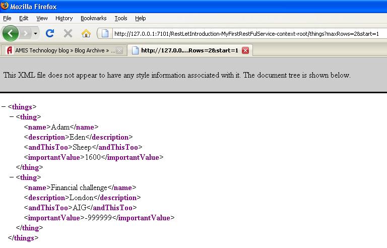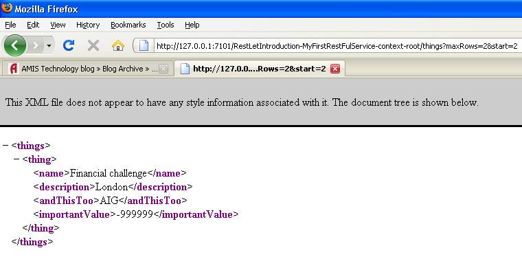 t all of the RangeSize rows. Since our sample data set only has 3 records, you really need to provide the maxRows parameter at a value of 1 or 2 in order to see the effect properly demonstrated. Note: the start parameter is 0-based: when you want to see the first row, the parameter should be set to 0. When you want to start at the second resource, it should be set to 1. You may want to do that somewhat differently to not alienate your service consumers.