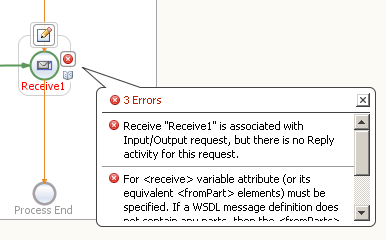 The process now needs to be connected to the partner link. Drag a Receive from the web palette to the center of the process. An icon with an envelope will appear. Drag this envelope to the envelope of the LsoPartnerLink. A green arrow will point from the LsoPartnerLink to the Receive.