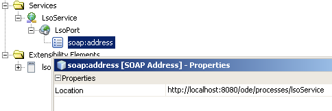 The file lsoWSDL.wsdl is opened. The next step is creating a service. We need a service to group portTypes and assign a url for ODE. This can be done by right clicking the services folder. Also add a port and a soap address. Change the names of the object so it matches this screenshot: