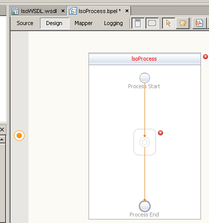 To give the process an interface (the WSDL we created a minute ago) drag the .wsdl to the center of a swimlane (the grey things at the right and left of the process). An orange dot will appear, meaning you can release your mouse button