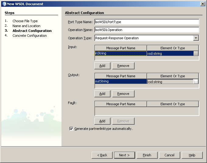 Create a new BPEL module by creating a new project (in the SOA folder). Call this process the LsoModule. Now we have to create a WSDL to define the input and output parameters. Right click the LsoModule, New, WSDL Document