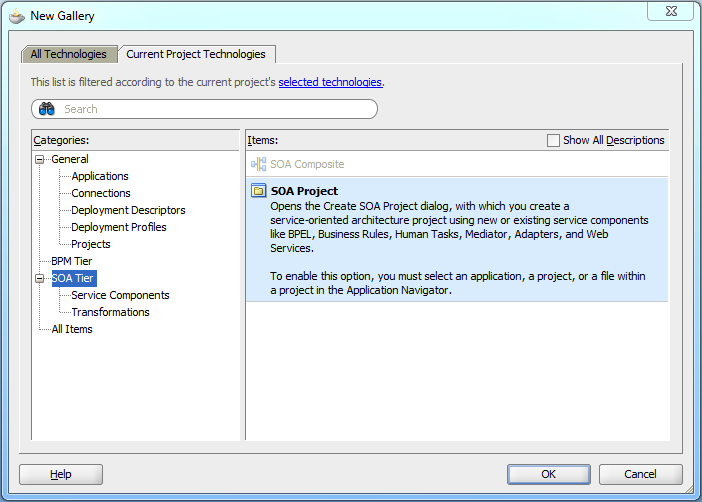 2) This will start the ‘Create SOA Project’ wizard. Specify a name for the project. I used ‘scaBPEL_setCompositeInstanceTitle’ for the name. Make sure that the SOA technology is selected.