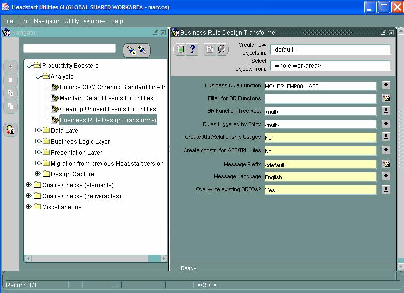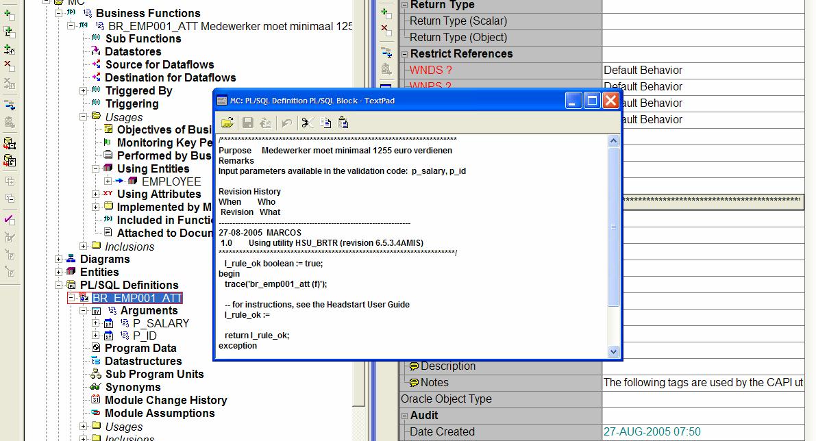 As the CDM RuleFrame utilities are PL/SQL packages, it is fairly simple to inspect them and modify them. If you how to write PL/SQL, know something about the inner workings of the Headstart Utilities as well as the meta-model and API of Oracle Designer, it is really quite straightforward. In this case, I have made some changes in the packages HSU_BRTR and HSU_CRBR.