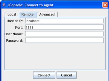On the Remote tab, connect to the host running the ADF BC application – for example localhost – and enter the same port number used in the com.sun.management.jmxremote.port argument when starting the ADF BC application.