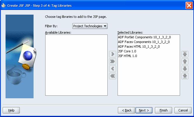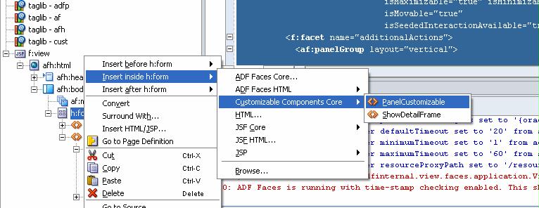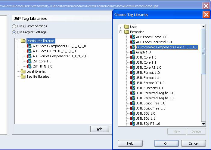 To be able to make use of the panelCustomizable and showDetailFrame components, we have to add the library and tag-library to our project. Inspect the project libraries to see whether it includes the Customizable Components library. Then inspect the JSP Tag Libraries for the project: