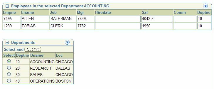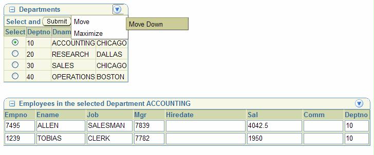 Let’s make things better! I will wrap the Departments table in a ShowDetailFrame component too, just like the Employees. Then I will surround both ShowDetailFrames with a panelCustomizable component. This container defines the context within which the children can be moved around and maximized