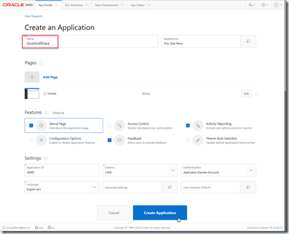 I provide the name, select a few application options – including Authentication using Application Express Accounts – and click Create Application: