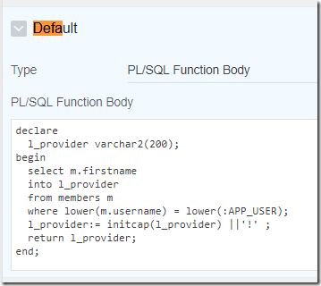 – how to derive a default value for a page item from one of the database tables using the user id for current user – see documentation on Session State Management, define default for page item of type PL/SQL Function Body, write a PL/SQL code block that returns value of the correct type; derive the value using the session state variable :APP_USER and perform a query against the MEMBERS table.