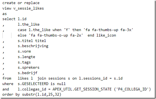 Look at the somewhat contrived way to sorting the records in a random order – to have every colleague see the sessions in a different order. Also not the where clause reference to the APEX_UTIL.GET_SESSION_STATE function used to filter the LIKES records by the current colleague’s id. Finally, note that like_icon expression – a CASE expression to return the image name depending on the like status.