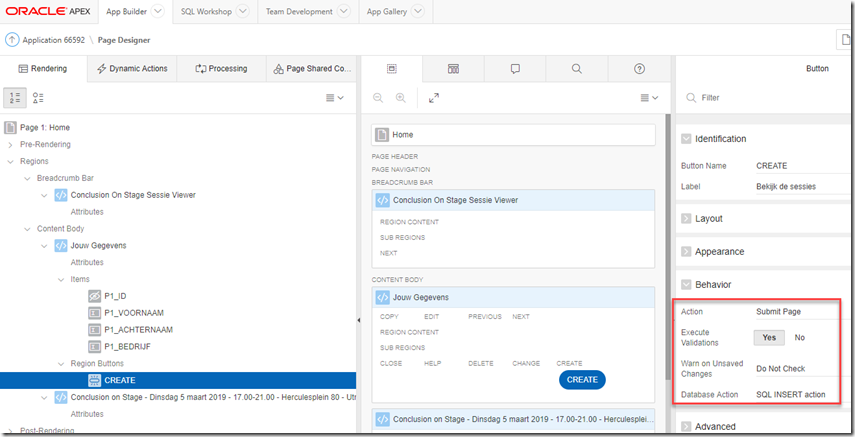 The Processes tab contains the entry to causes the navigation to Page 4 when the Create button is click on. The value of item P1_ID is copied to P4_COLLEGA_ID (in Page 4)