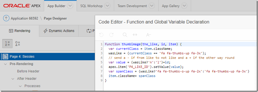 Note how the APEX JavaScript library is used to programmatically set the value of item P4_LIKE_ID – using the id value from the session record that was clicked. Note how an n(ot paticularly like) or l(ike) is prepended to the id value.