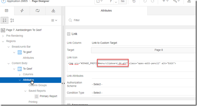 Instead of the standard pencil icon, I would like to use a different icon to drill down to the details page. Using a blog article, I have learned that I should edit the attributes of the Interactive Report template instance in the current page. The Link Icon attribute defines the icon that is shown. It is easily changed to a different icon.