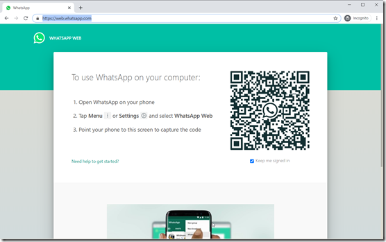 [/CODE]When this application is executed, an incognito browser window opens and a QR code is presented. You need to scan this QR code in the WhatsApp app on your mobile phone – every time the Node application is restarted.