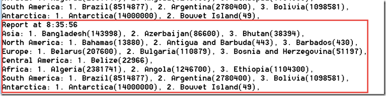 This program reports: top 3 largest countries per continent (periodically, with a configurable interval)