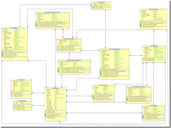 The formula one data is available to me (and you: see how in this article that allows you to fire up an Oracle Database 23c Free instance in a Gitpod workspace with a single click) in a relational database schema – 14 tables: