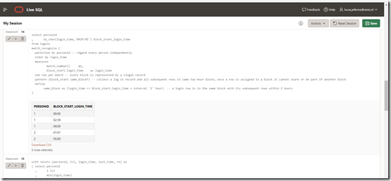select personid , to_char(login_time,’HH24:MI’) block_start_login_time from logins match_recognize ( partition by personid — regard every person independently order by login_time measures match_number() mn, block_start.login_time as login_time one row per match — every block is represented by a single record pattern (block_start same_block*) — collect a log in record and all subsequent rows in same two hour block; once a row is assigned to a block it cannot start or be part of another block define same_block as (login_time <= block_start.login_time + interval ‘2’ hour) — a login row is in the same block with its subsequent rows within 2 hours )