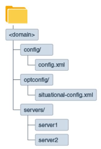 Situational configuration files end with the suffix “situational-config.xml” and are domain configuration files only, which reside in a new optconfig directory. Administrators create, update, and delete situational-config.xml files in the optconfig directory.