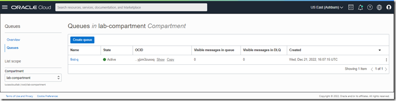 OCI CLI Command reference for Queue – https://docs.oracle.com/en-us/iaas/tools/oci-cli/3.22.0/oci_cli_docs/cmdref/queue.html