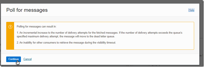I click on Poll for messages. The console now behaves a little like a message consumer: it polls for messages. The console cannot truly consume messages (it cannot delete the messages from the queue). Every time however the console polls a specific message, the delivery attempt count for the message is increased. The popup that appears after I press the poll button says as much: