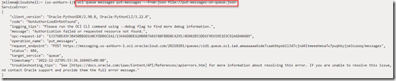 oci raw-request –http-method POST –target-uri https://cell-1.queue.messaging.us-ashburn-1.oci.oraclecloud.com/20210201/queues/ocid1.queue.oc1.iad.amaaaaaa6sde7caak6kpobll3d7cjnd4ltmeeehmxa7w7puqhkyjzm3zuooq/messages –request-body file://put-messages-on-queue.json