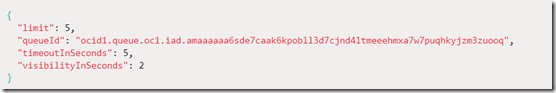 oci raw-request –http-method GET –target-uri https://cell-1.queue.messaging.us-ashburn-1.oci.oraclecloud.com/20210201/queues/ocid1.queue.oc1.iad.amaaaaaa6sde7caak6kpobll3d7cjnd4ltmeeehmxa7w7puqhkyjzm3zuooq/messages?visibilityInSeconds=3599&limit=5