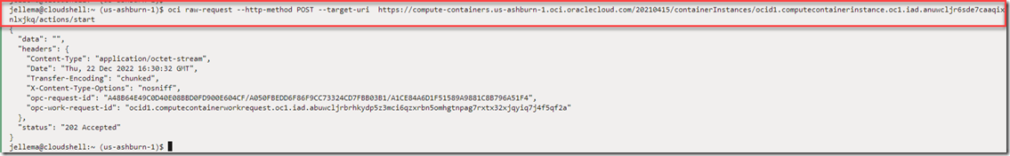oci raw-request –http-method POST –target-uri https://compute-containers.us-ashburn-1.oci.oraclecloud.com/20210415/containerInstances/ocid1.computecontainerinstance.oc1.iad.anuwcljr6sde7caaqixbrxeuu22akkenq4i3h3d2miwe3acuqpr5genlxjkq/actions/start