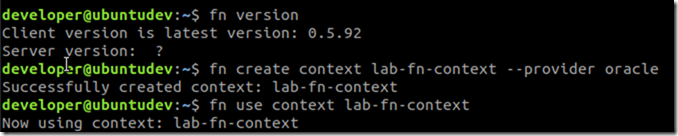 Using a fresh OCI Cloud Tenancy and a local VM: Ubuntu 18.04 with Docker 19.03.5. In this VM, I run a Docker Container that contains the OCI CLI (as described in this article: https://technology.amis.nl/2018/10/14/get-going-quickly-with-command-line-interface-for-oracle-cloud-infrastructure-using-docker-container/) . A small configuration file lives outside the container and is mounted into the container contains tenancy details and the private key. This same file is used in the FN context that I use when deploying and invoking functions.