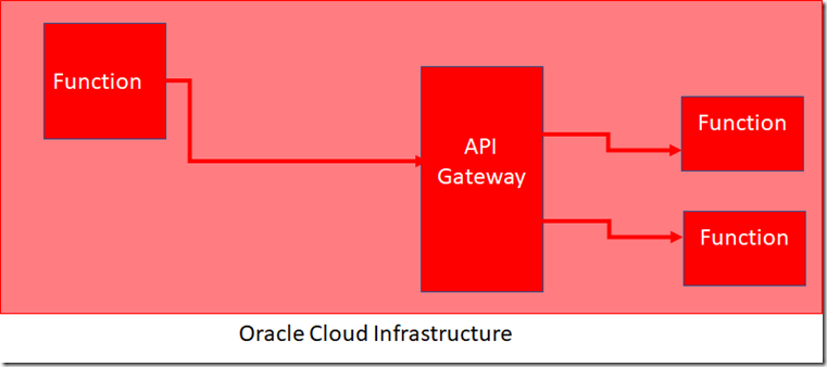 Let’s discuss the second and third option – Function calls function through API Gateway (synchronously) and function calls function through Streaming (and listener) (asynchronously). EDIT (26 February 2020): checkout this article for an example of an aysnchronous call from function to function using a Notification Topic as an in between queue mechanism: https://www.ateam-oracle.com/oci-increases-notifications-fan-out-by-adding-functions-support .