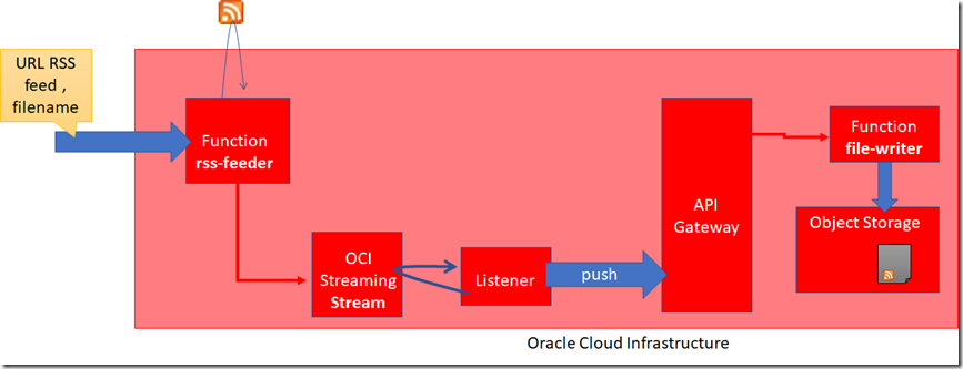 I will show a very simple example of a function that reads an RSS feed from a URL passed as parameter and has that feed’s contents written as a JSON document to OCI Object Storage by a second function: file-writer, introduced in a recent article.
