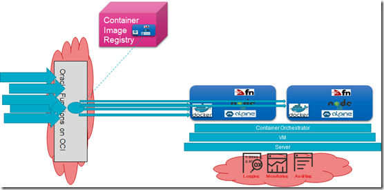 When the Function is built, a Docker container image is created – typically through the Fn Command Line Interface. The mental picture of deploying the function consists of handing the container that contains the function implementation to some black box execution engine, adding any number of configuration parameters to influence the environment specific runtime behavior.