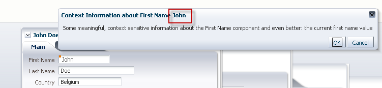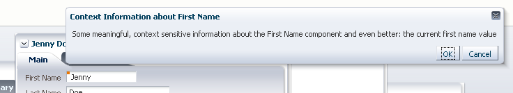 To present information in the context popup that is really context sensitive, we need to have access to meaningful values associated with the component the context is presented for. In this case we would need to have the actual value of FirstName available inside the context popup.